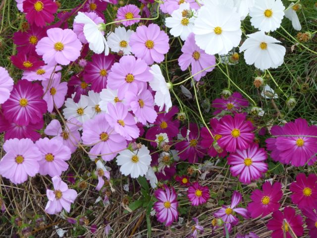 Überall bereits zwischendurch in Gärten, an Wegrändern und Feldern Cosmosblumen. So schön, diese Cosmea, die habe ich schon immer gemocht, aber von meinen Balkon-im Topf-wachs-Versuchen nicht gewußt, wie hoch sie tatsächlich werden können. Ich mag ihre Zartheit, das durchsichtige Grün, das ein wenig wie Karotten oder Fenchel aussieht, den tollen Rosa- und Pinkton, weiß dazwischen und hin und wieder auch gelb und orange. So schön. Einen anderen Radler traf ich öfters einmal wieder bzw überholten wir uns ständig gegenseitig, weil mal er und mal ich stehenblieb, um die Blütenpracht aufs Bild zu bannen. Interessanterweise habe ich ihn dann aber nicht mehr an dem Ort gesehen, der mich überhaupt auf die Idee dieser Radtour gebracht hatte.