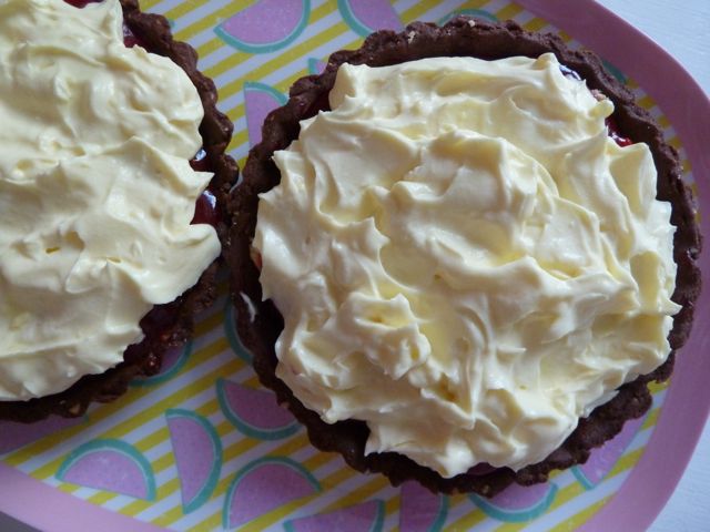 Auch die Himbeertartelettes waren sehr fein. Hier bedeckt von Vanillecreme mit Mascarpone, eine etwas andere Zusammensetzung als bei den Erdbeertörtchen.